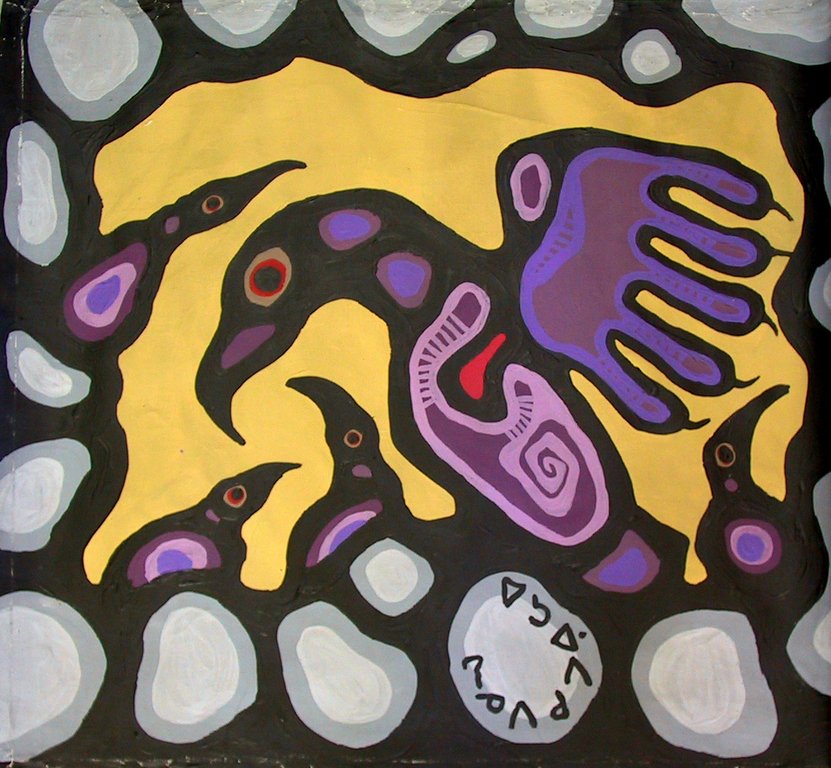Added: 6230 days ago Views: 1094 URL: Embed : Description: Visual Description : In the centre of the painting is an adult bird with four chicks. Their bodies are black with various shades of purple. Their eyes are black, red, and taupe. The edges of the painting are black, blending into the bodies of the birds. Grey circular forms surround the birds on all four sides.